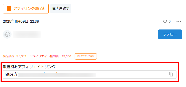 すでにリンクを発行済みの記事の場合は、記事ページ内にアフィリエイトリンクが表示されているので、同じアフィリエイトリンクを表示・コピーすることが可能です。